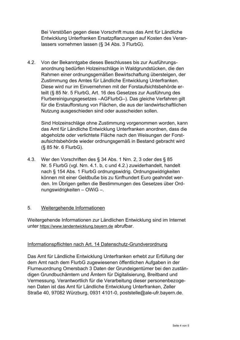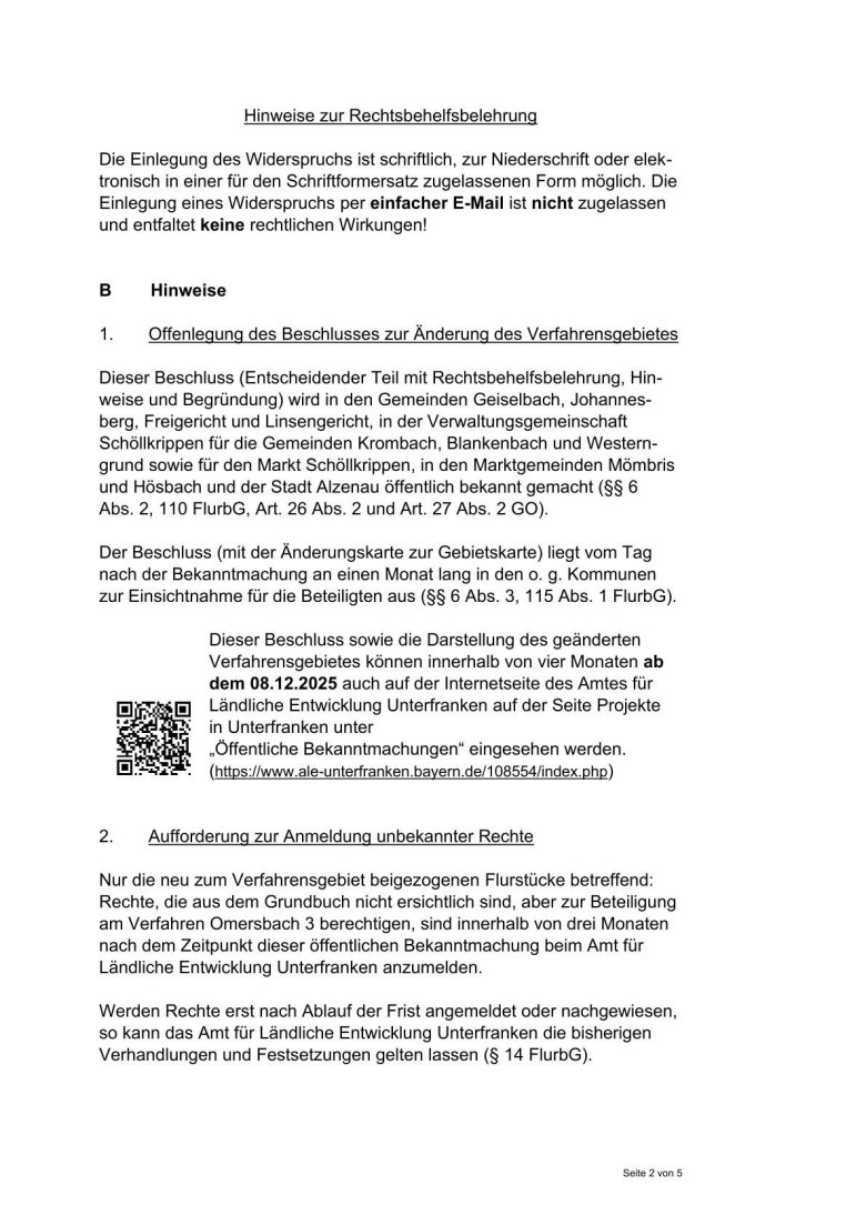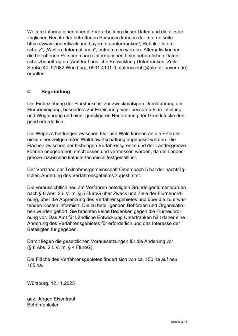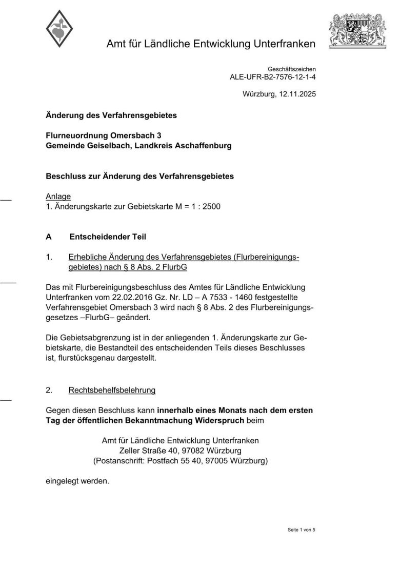 Bekanntmachung Flurneuordnung Omersbach3, Gemeinde Geiselbach, Landkreis Aschaffenburg: Änderung des Verfahrensgebietes