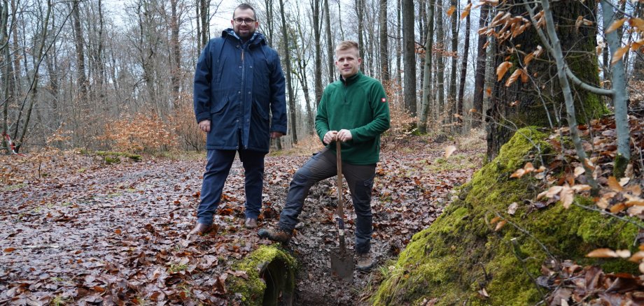 „Gerade die oft wenig sichtbaren Maßnahmen im Wald leisten einen entscheidenden Beitrag zum Schutz unserer Ortslage“, erklärte Bürgermeister Waldemar Gogel. Über die Jahre hatte sich in vielen Gräben und Durchlässen Erde, Laub und angeschwemmtes Material angesammelt. „Das wird alles ausgehoben, damit der Durchlass wieder frei ist und das Wasser ungehindert ablaufen kann“, so Forstwirt Betz. Diese Durchlässe – meist Rohre unterschiedlicher Größe – sorgen dafür, dass Regen- oder Tauwasser kontrolliert abgeleitet wird und sich nicht unkontrolliert staut. Ergänzt wird dieser Hochwasserschutz durch natürliche Rückhaltemaßnahmen im Wald. Diese Becken, Mulden oder Vertiefungen nehmen Wasser auf und halten es zurück, sie nehmen Tempo aus den Wassermassen und lassen es deutlich geregelter weiterfließen. „Unten im Ort kommt das Wasser dadurch mit weniger Masse und deutlich langsamer an“, erklärte der Forstwirt. Das ist ein wichtiger Beitrag zum vorbeugenden Hochwasserschutz.