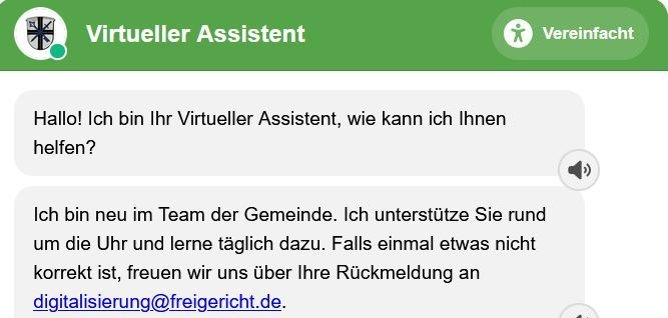 Die Gemeinde Freigericht lädt alle Bürgerinnen und Bürger ein, den neuen virtuellen Assistenten auszuprobieren und die digitalen Möglichkeiten zu entdecken. Anregungen und Rückmeldungen zur Weiterentwicklung können gerne an digitalisierung@freigericht.de gesendet werden.